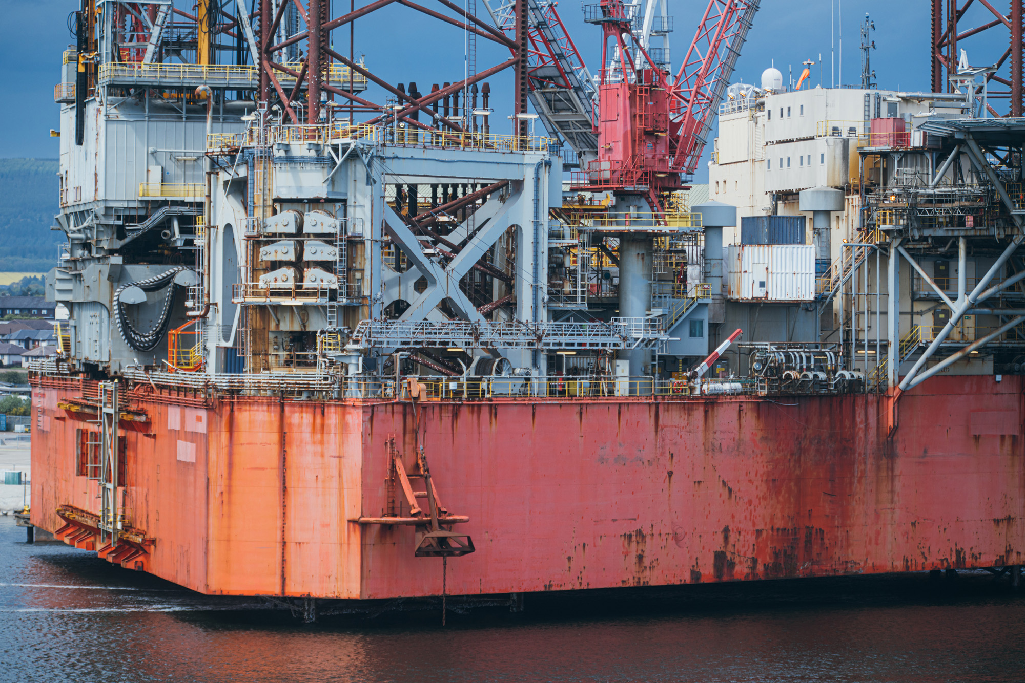 The giant Hutton tension leg platform is being moved to the Queen's Dock at Invergordon. The process of lifting the 500 tonnes of chains and anchors and towing the platform five miles to Invergordon took 36 hours and involved six tugs accompanied by a rescue boat.